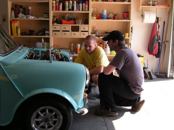 Franz und Hannes haben mich unterstützt. Die Halbachsen haben nicht gleich rein wollen, auch das Anschrauben der Motorbackl ist schon mal leichter